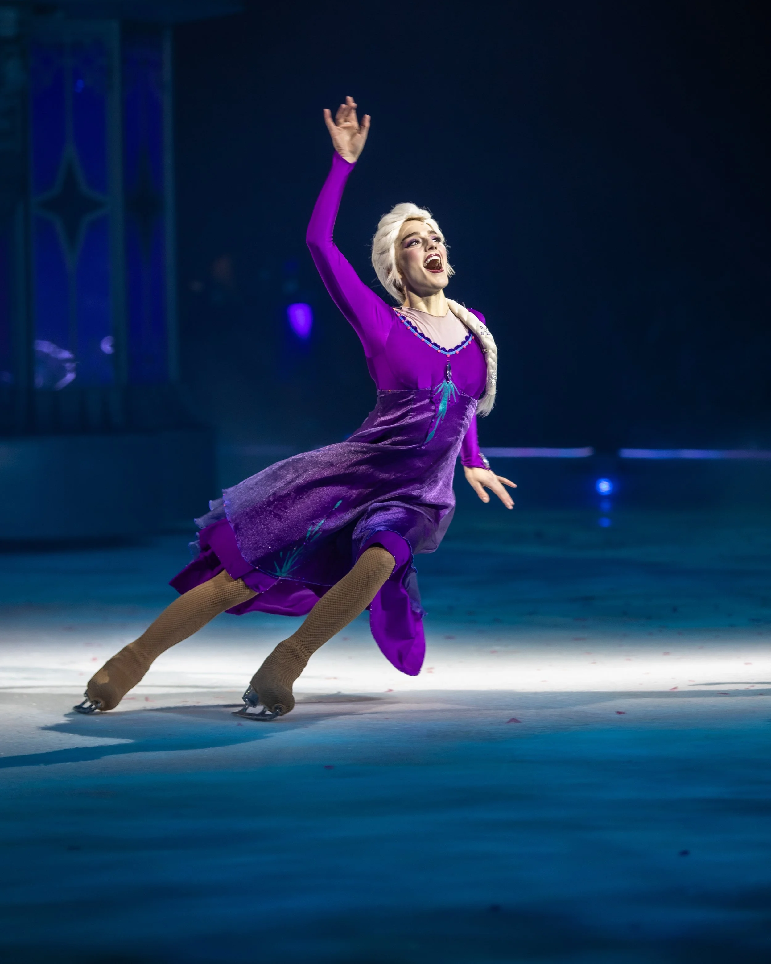 A woman figure skating on ice, dressed in a purple costume, performing an elegant move with one arm raised, inside an indoor ice rink.